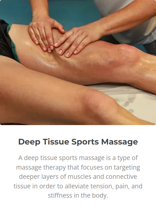 A deep tissue sports massage is a type of massage therapy that focuses on targeting deeper layers of muscles and connective tissue in order to alleviate tension, pain, and stiffness in the body.