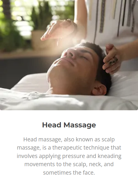Head massage, also known as scalp massage, is a therapeutic technique that involves applying pressure and kneading movements to the scalp, neck, and sometimes the face.
